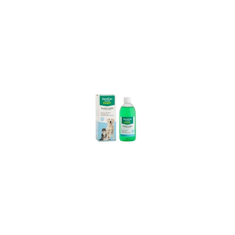 DENTICAN SOLUBLE. DENTÍFRICO SOLUBLE Novedosa presentación para la higiene buco-dental de las mascotas. El producto se disuelve cómodamente en el agua de bebida, supliendo la acción directa del cuidador en la higiene bucal diaria de la mascota. Formulado con digluconato de clorhexidina, fluoruro sódico y gluconato de Zinc. Los agentes antibacterianos de Dentican Soluble, le proporcionan una higiene bucal completa, evitando la formación de la placa bacteriana, la aparición del sarro y eliminando el mal aliento. Puede ser usado en perros a partir de 6 meses de edad. Modo de empleo: Diluir 1 tapón de DentiCan Soluble por cada litro de agua de bebida. Cambiar el agua todos los días.