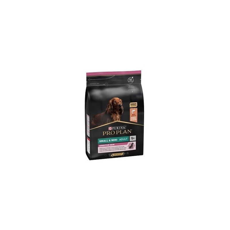 PURINA PRO PLAN Small&Mini Adult sensitive skin con OPTIDERMA rico en salmón es un alimento seco completo para perros de razas pequeñas y miniatura con la piel sensible. Diseñado científicamente para favorecer un pelaje brillante y una piel saludable.