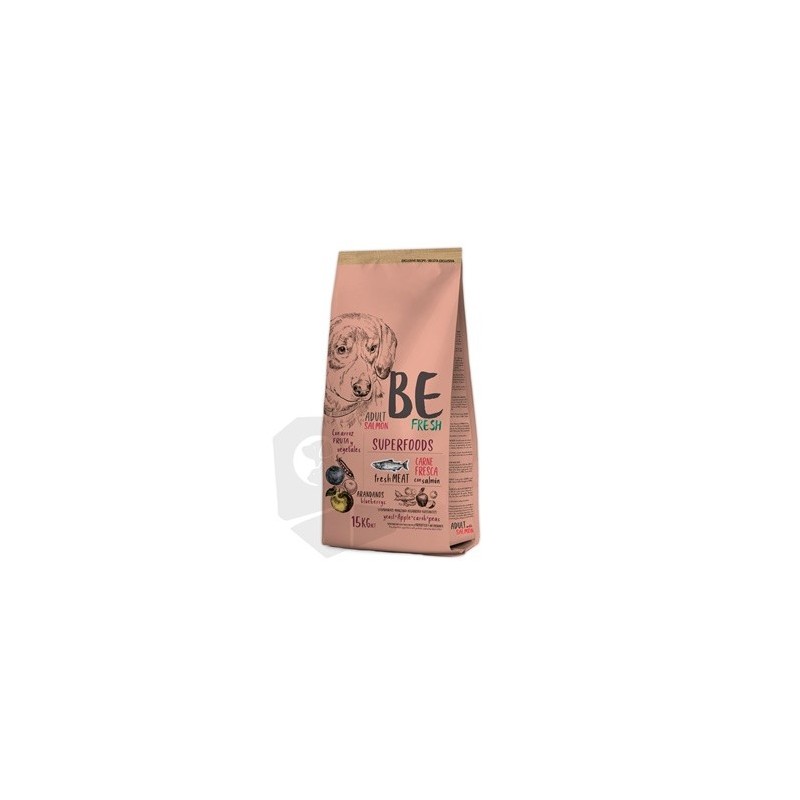 Composición Be Fresh Adult Salmon: Proteína deshidratada de pollo 23%. Arroz 13%. Pollo fresco 10%. Trigo 9%. Salvado de arroz 9%. Grasa de ave 8%. Proteína deshidratada de salmón 5%. Cebada 4,5%. Guisantes 4,5%. Salvado de trigo 4,5%. Patata 2,7%. Hidrolizado de salmón 2,5%. Maiz 1%. Pulpa de manzana 0,5% (fuente de FOS). Levaduras 0,5% (fuente de MOS). Garrofa 0,5%. Minerales 0,3%. Arándanos 0,1%. Componentes analíticos: Proteína bruta 29,00%. Grasa bruta 18,00%. Fibra bruta 2,00%. Ceniza bruta 8,00%. Calcio 1,75%. Fósforo 1,25%.