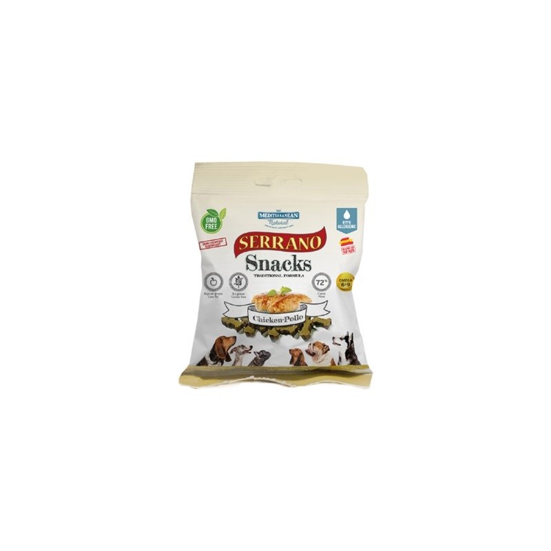 Los Serrano Snacks de MEDITERRANEAN NATURAL, delicadamente cortados en pequeñas cantidades con forma de huesito, garantizan la seguridad de la mascota, mantienen su pureza y todos los nutrientes, reflejan la dieta natural y contienen al menos 70 % de carne