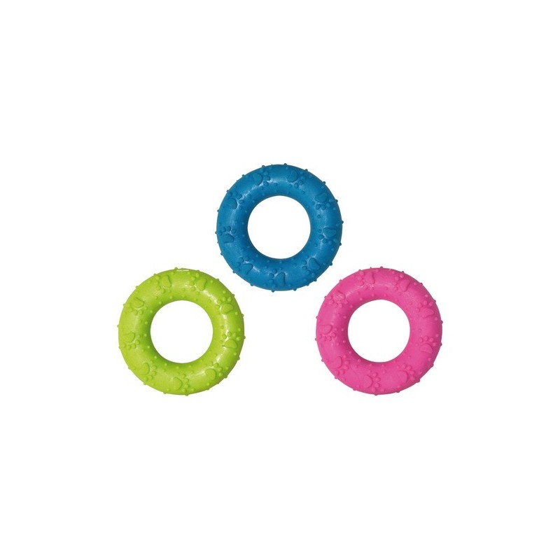 Circulo de goma de 7cm con pinchos. Pensado para los más minis o puppy's. Material de gran durabilidad y con pinchos en su superfície para masajear encías y colaborar con la higiene dental de nuestras mascotas. Disponible en tres colores.