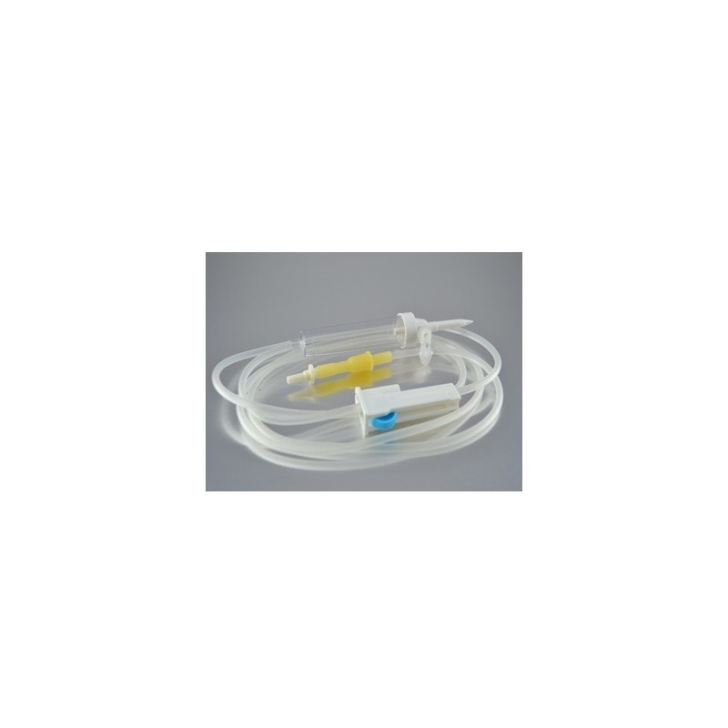 Con punzón para conexión a bolsa o frasco. Toma de aire con filtro antibacteriano y sistema de cierre. Cámara de goteo con tubo de entrada que permite el paso de 20 gotas/ml. Tubo de plástico de 150 cm., con llave reguladora de flujo, con pieza de látex y conexión Lúer. Indicado para la administración de la mayor parte de soluciones intravenosas.. Producto también llamado infusor Marca: Perfuset Fabricante: SENDAL.