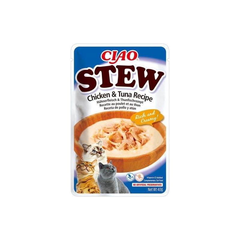 Churu Gato STEW Guiso De Atún con Pollo es un estofado de pollo, dáselo a tu gato como complemento a su dieta.
