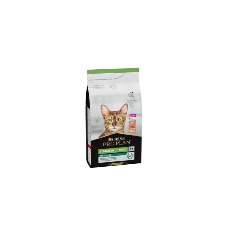 PURINA PRO PLAN STERILISED Adult 1+ RENAL PLUS es un alimento completo para gatos adultos esterilizados, rico en salmón, que favorece una función renal saludable.