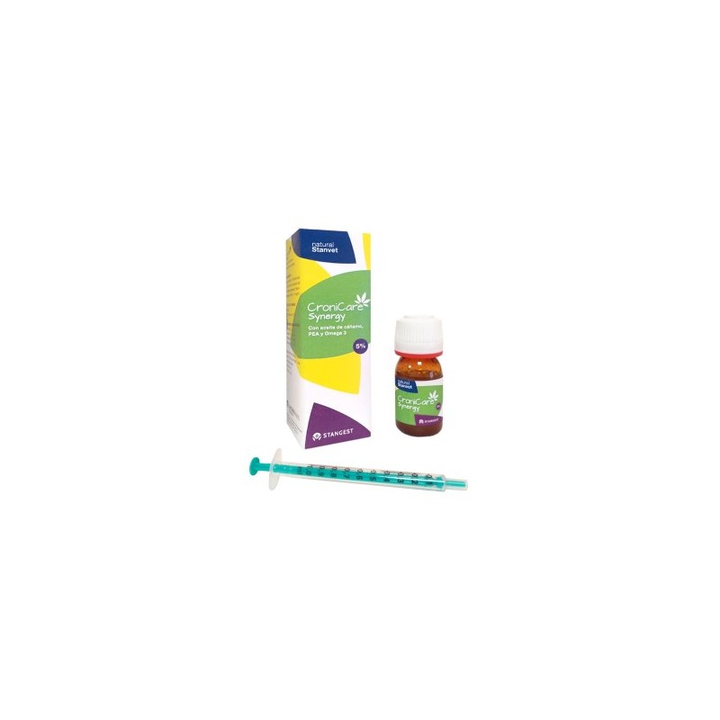 CroniCare Synergy es un suplemento nutricional a base de cáñamo (Cannabis sativa) y plamitoiletanolamida (PEA), dos tipos de cannabinoides que sinergizan entre sí para ejercer un potente efecto en el organismo. La fórmula exclusiva aporta también Omega 3 y triglicéridos de cadena media (TCM). La interacción sinérgica de PEA y aceite de cáñamo mejora la biodisponibilidad de la PEA y prolonga su acción en el organismo al ralentizar su degradación hepática. La dosificación más concentrada de CroniCare Synergy permite una mayor duración del producto, ideal para animales grandes, tratamientos de largo recorrido y altos requerimientos.