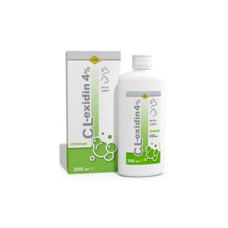 CL Exidin 45 champú es un champú desinfectante que contiene clorhexidina digluconato, antibacteriano de amplio espectro muy utilizado en veterinaria.