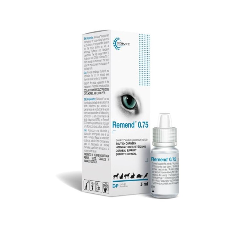 Remend 0,75 proporciona una hidratación y lubricación prolongadas para el ojo seco o irritado. Mejora la comodidad ocular del animal. Como complemento para el tratamiento de lesiones corneales superficiales en apoyo a la regeneración celular.