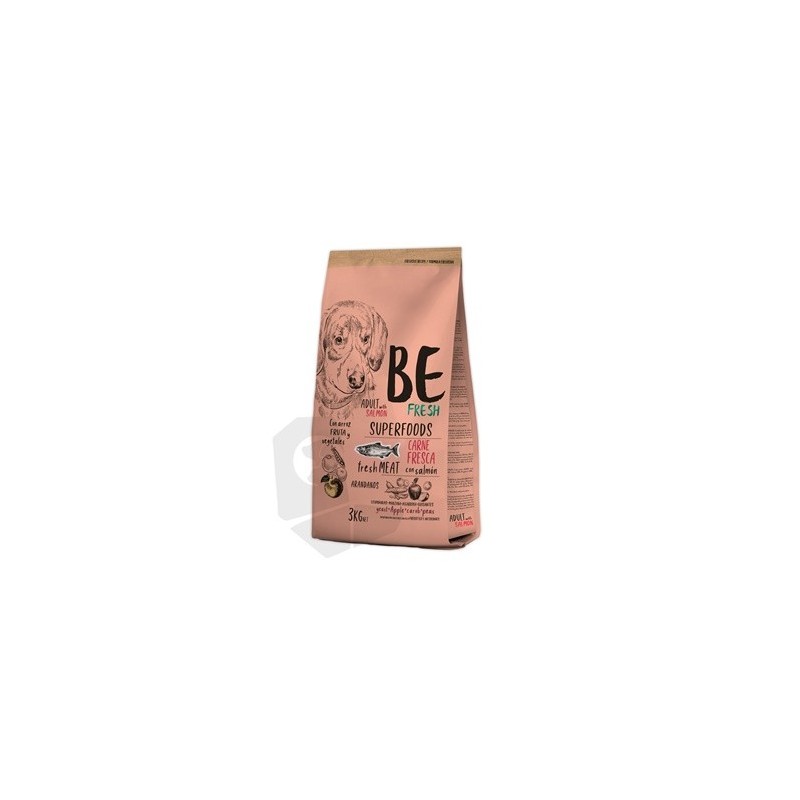 Composición Be Fresh Adult Salmon: Proteína deshidratada de pollo 23%. Arroz 13%. Pollo fresco 10%. Trigo 9%. Salvado de arroz 9%. Grasa de ave 8%. Proteína deshidratada de salmón 5%. Cebada 4,5%. Guisantes 4,5%. Salvado de trigo 4,5%. Patata 2,7%. Hidrolizado de salmón 2,5%. Maiz 1%. Pulpa de manzana 0,5% (fuente de FOS). Levaduras 0,5% (fuente de MOS). Garrofa 0,5%. Minerales 0,3%. Arándanos 0,1%. Componentes analíticos: Proteína bruta 29,00%. Grasa bruta 18,00%. Fibra bruta 2,00%. Ceniza bruta 8,00%. Calcio 1,75%. Fósforo 1,25%.