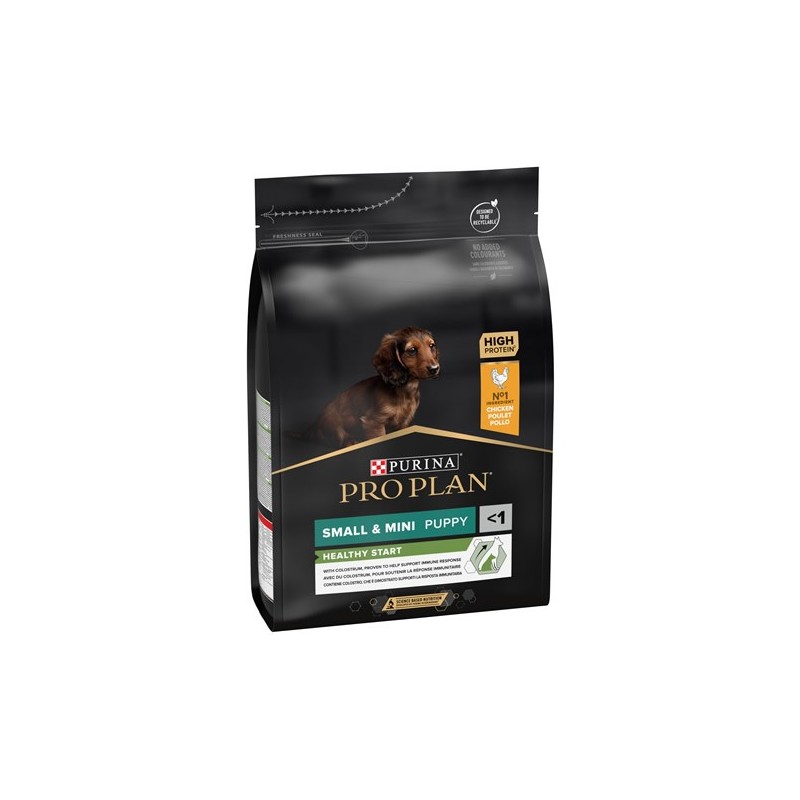 PURINA PRO PLAN Puppy Small & Mini Healthy Start es un alimento completo para cachorros de razas pequeñas y miniatura, rico en pollo. También es adecuado para perras gestantes / lactantes. Contiene calostro, que se ha demostrado que apoya a la respuesta inmunitaria.