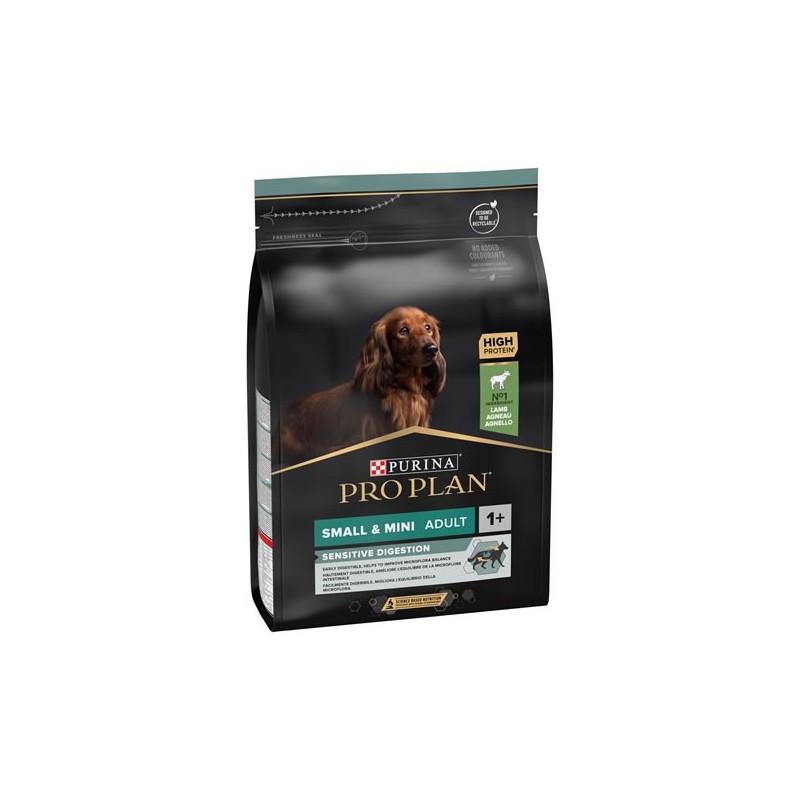 PURINA PRO PLAN Small & Mini Adult Sensitive Digestion rico en Cordero es un alimento completo para perros adultos de razas pequeñas y miniatura con una digestión sensible. Fácilmente digestible y demostrado que mejora del equilibrio de la microflora intestinal.