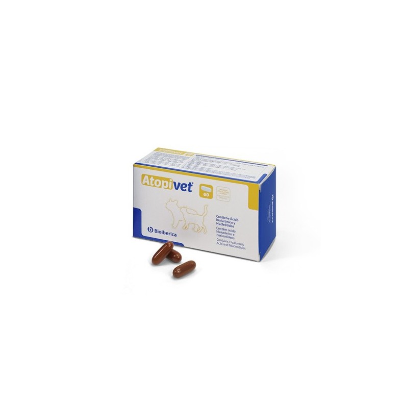 Atopivet es un suplemento natural a base de Omega 3 Nucleotidos ,Omega 6, Ácido Hialurónico, Óxido de zinc y vitamina e, que contribuyen a mejorar el estado de la piel.