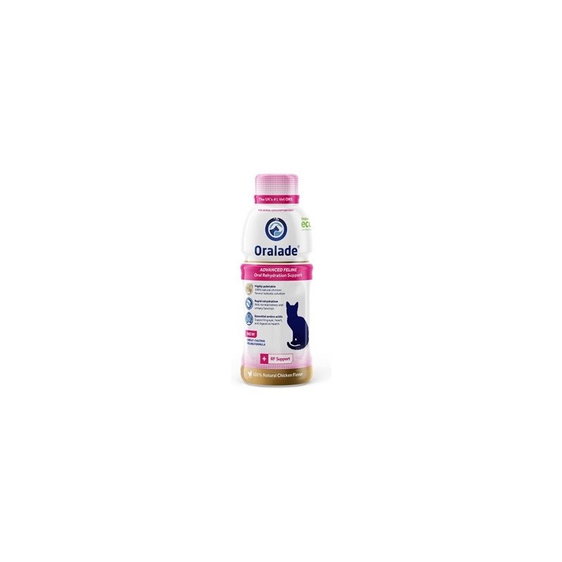 Oralade® RF es una SRO (Solución de Rehidratación Oral) que contribuye a la rehidratación de gatos que padecen trastornos agudos de malabsorción intestinal y Enfermedad Renal Crónica. Bajo contenido en grasas y proteínas que favorece su digestibilidad. Contiene electrolitos, glucosa simple y aminoácidos: lisina, arginina, L carnitina y taurina.